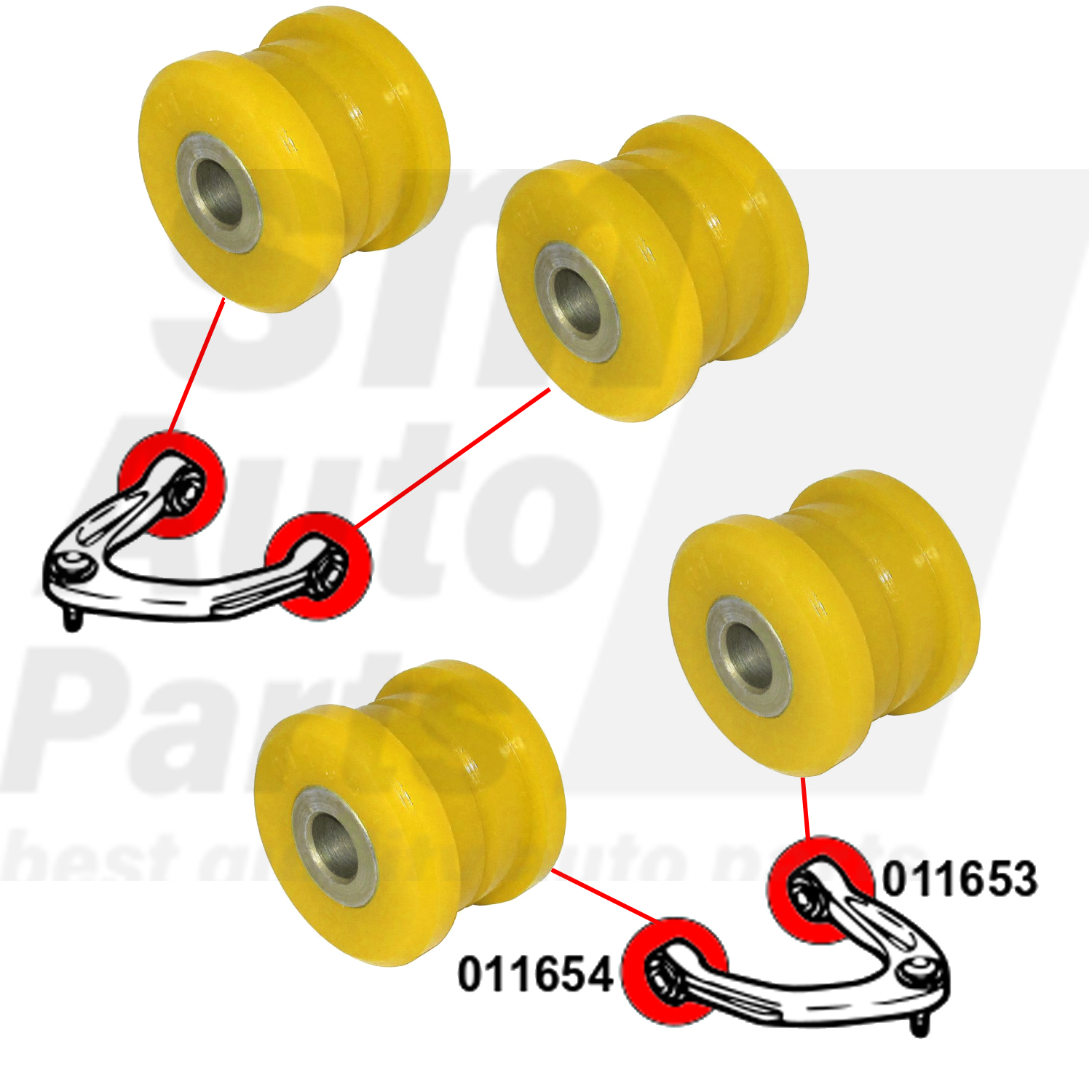 - This bush is only available in 90ShA hardness (yellow) because the original rubber bush is made of a hard rubber compound. The use of the 80ShA hardness bush (red) will reduce the driving of the car to the original rubber bush.